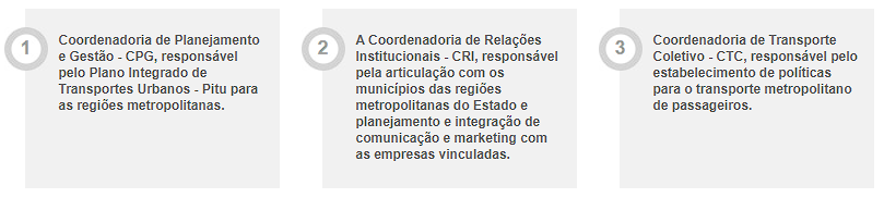 Também é responsável pela organização, coordenação, operação e fiscalização do sistema metropolitano de transportes públicos de passageiros e de sua infraestrutura viária.
